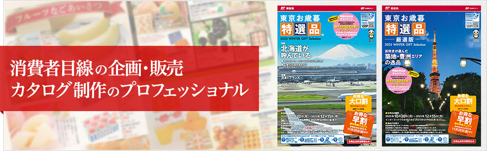 当社の主力カタログである「東京お中元特選品」「東京お歳暮特選品」は、1985年の創刊以来、東京都内の郵便局をご利用になるお客様を中心に、多くのお客様からご支持いただいております。 また、2015年からは「東京お中元特選品」「東京お歳暮特選品」カタログの「厳選版」を発行し全国の郵便局でお申し込みいただけるようになりました。